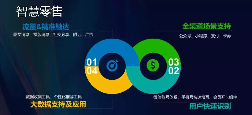 針對加速厘革、不停智慧升級的零售行業(yè),微信開放平臺以賦能行業(yè)為目標(biāo),通過各種能力,幫手零售企業(yè)構(gòu)成持續(xù)不停的正向循環(huán)。