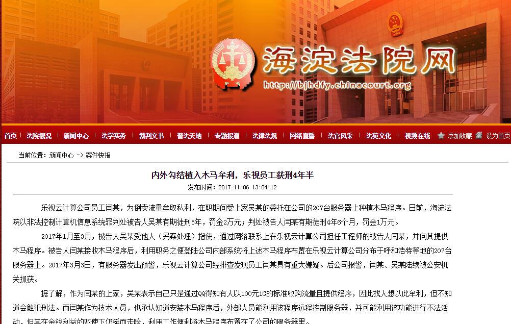 近日,北京海淀法院網(wǎng)站公布消息稱:樂(lè)視云計(jì)算公司員工閆某,為倒賣流量牟取私利,在職期間受上家吳某的委托在公司的 207 臺(tái)辦事器上種植木馬程序。日前,海淀法院以不法控制計(jì)算機(jī)信息系統(tǒng)罪判處被告人吳某有期徒刑 5 年,罰金 2 萬(wàn)元;判處被告人閆某有期徒刑 4 年 6 個(gè)月,罰金 1 萬(wàn)元。