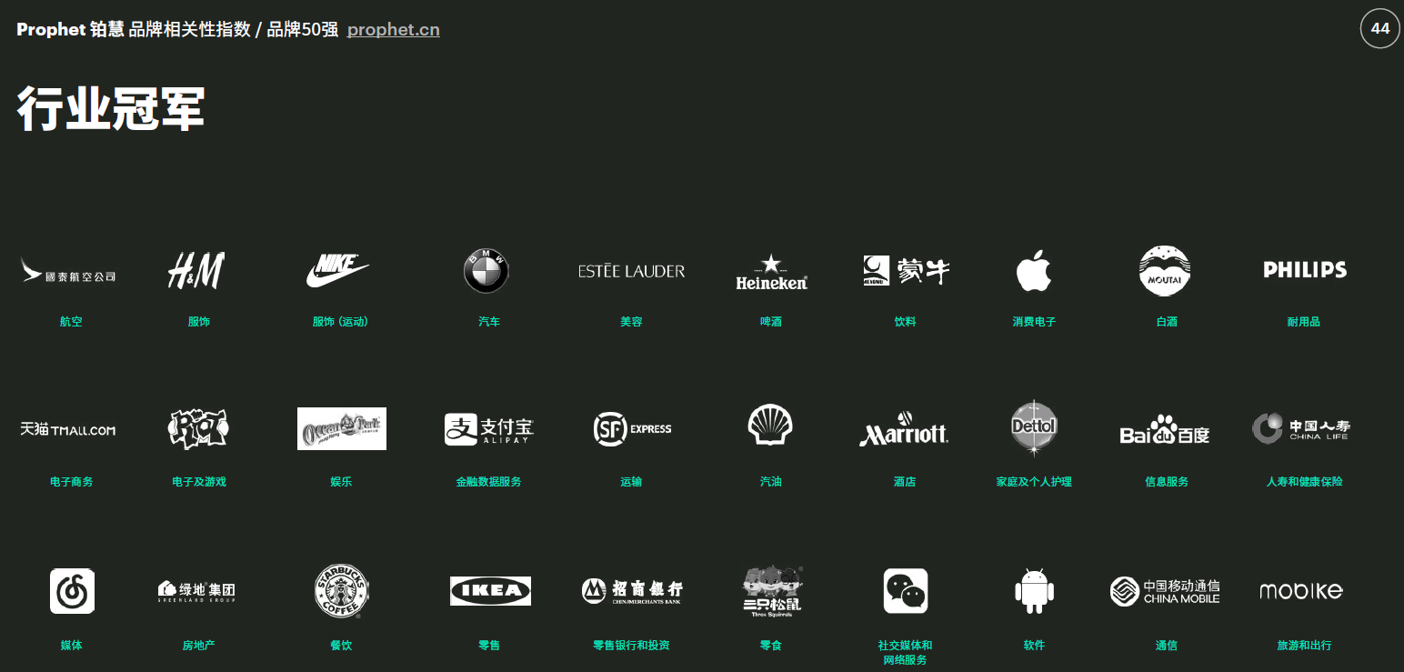 Prophet鉑慧是一家國際化、專業(yè)性的品牌研究機(jī)構(gòu)和設(shè)計咨詢公司。辦公室位于香港銅鑼灣,擁有融合多元化咨詢經(jīng)歷配景、國家和文化的團(tuán)隊,其評估得到各界一致推崇?!?2017 年度中國最具相關(guān)性品牌 50 強(qiáng)”匯集了各行業(yè)的頂級品牌。除摩拜單車外,支付寶和微信別離位列 2017 品牌 50 強(qiáng)榜單的第一名和第二名。Android、宜家家居及Apple緊隨其后,躋身前五。排名前 20 位的著名品牌還包孕耐克、寶馬、華為、英特爾、微軟、阿迪達(dá)斯等。