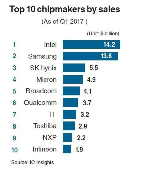 (2017 年 Q1 各大半導(dǎo)體廠商營收排名,圖片來源:IC Insights)