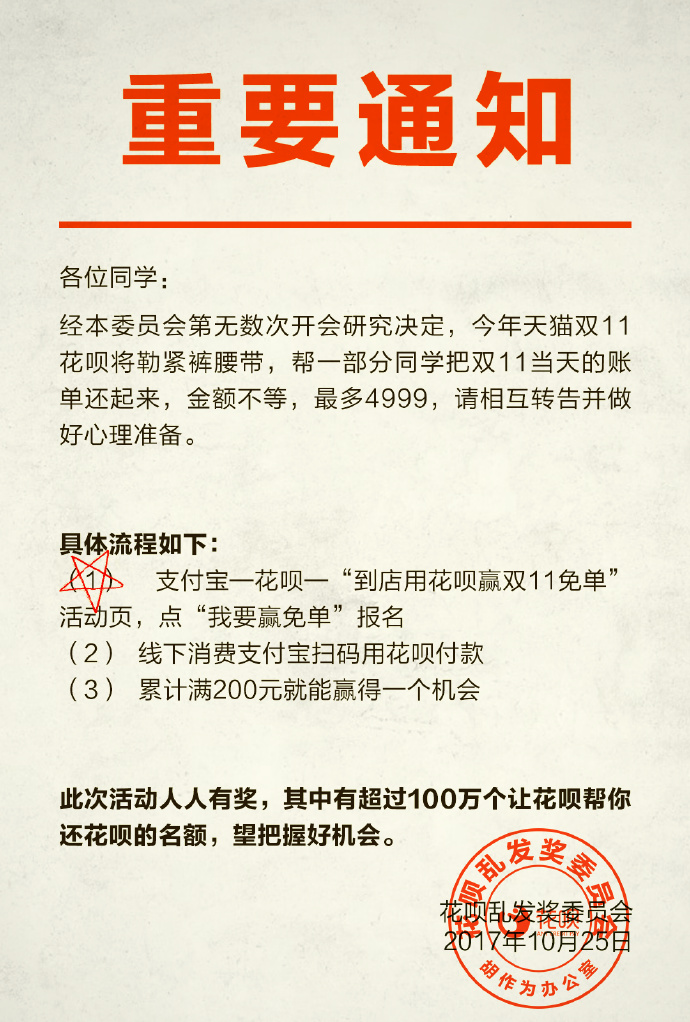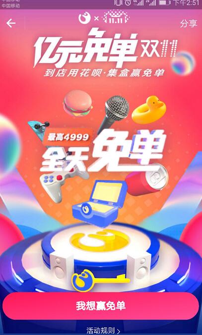 據(jù)介紹,參加該活動人人都有獎品,超過 100 萬個用戶可以享受花唄資助還款的機會。其中雙十一全天免單,最高可免 4999 元的名額有 1111 個;免最高一筆的名額有 5000 個,限制最高 500 元;8— 88 元隨機還款紅包的有 500000 個,1—10 元的隨機花唄紅包不限。
