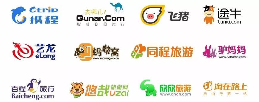 有些特定門類或行業(yè)的互聯(lián)網(wǎng)公司,動物形象的比例高得離譜,完全可以組成行業(yè)內(nèi)的動物園。譬如排名前十的旅游網(wǎng)站中,就有 8 個商標(biāo)或名字包羅動物,在前十之后,你還會看到一大堆動物,,幾乎可以說是「無動物不旅游」。