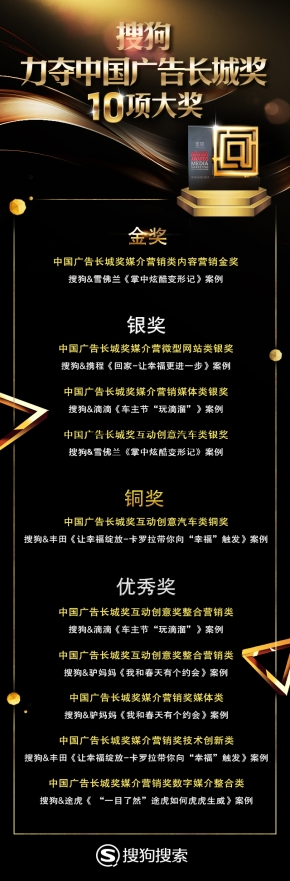 10月22-24日,第24屆中國國際廣告節(jié)在長沙隆重舉行。被業(yè)界譽為“廣告賽事之泰山”的中國廣告長城獎頒獎典禮也如約而至。搜狗本次一舉斬獲10項大獎。其中,搜狗&雪佛蘭共同打造的《掌中炫酷變形記》案例,勇奪2017中國廣告長城獎媒介營銷類金獎。搜狗商業(yè)市場部總經(jīng)理馬艷玲也應邀出席本次大會, 為大家?guī)砭实摹癆I ,讓營銷更智能”主題演講。