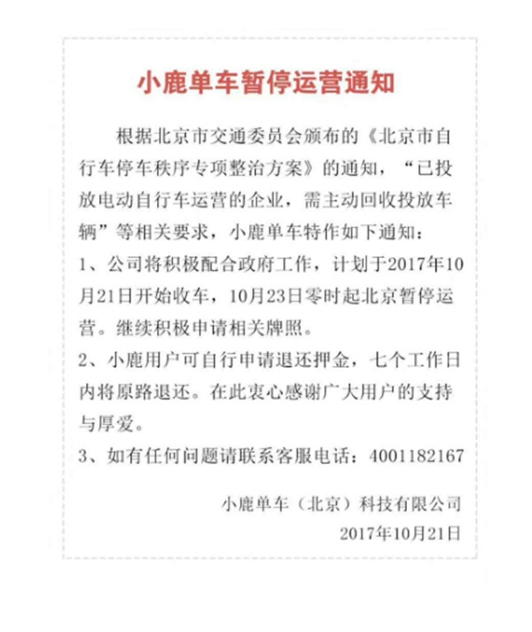 10 月 21 日,共享單車(chē)小鹿發(fā)布公告,公司計(jì)劃將于 10 月 23 日零時(shí)起北京暫停運(yùn)營(yíng),小鹿用戶可自行申請(qǐng)退還押金, 7 個(gè)工作日之內(nèi)押金將原路退還。