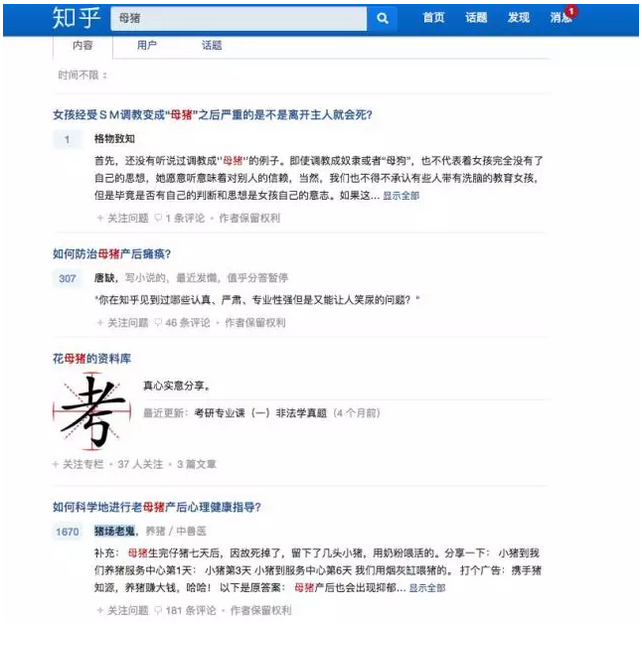 悟空問答流淌著頭條的基因,最擅長的就是做用戶下沉,你不信?你上知乎搜索“母豬”會發(fā)現(xiàn),母豬產(chǎn)后癱瘓會被認為“讓人笑尿”的問題。