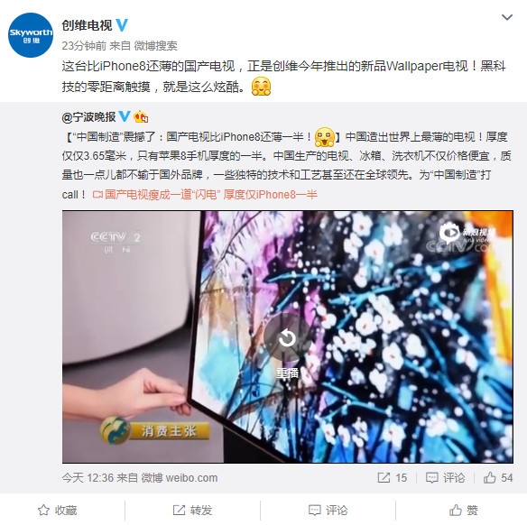 今日,@創(chuàng)維電視 轉(zhuǎn)發(fā)央視財(cái)經(jīng)報(bào)道視頻體現(xiàn):“比iPhone8 還薄的電視,燃爆你們的眼球,讓黑科技不只是說(shuō)說(shuō)罷了。這款集美貌與實(shí)力的電視,正是創(chuàng)維新品Wallpaper?!?/p>