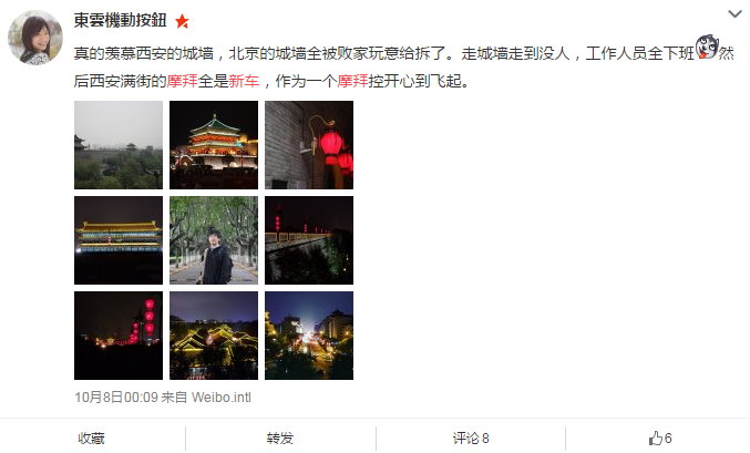 新車一經(jīng)投放,在微博、微信伴侶圈上,可以看到用戶不停體現(xiàn)對(duì)摩拜新車的青睞和對(duì)摩拜智能化科技的推崇。微博網(wǎng)友@東雲(yún)機(jī)動(dòng)按鈕體現(xiàn),真的羨慕西安的城墻,北京的城墻全被敗家玩意給拆了。走城墻走到?jīng)]人,工作人員全下班,然后西安滿街的摩拜全是新車,作為一個(gè)摩拜控開心到飛起。