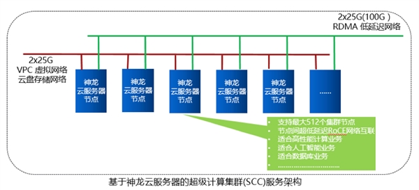 針對高性能計算,阿里云還將推出基于神龍云辦事器的超級計算集群(SuperComputer Cluster),各節(jié)點之間采用高帶寬低延遲的RDMA網(wǎng)絡(luò)互聯(lián),RoCE網(wǎng)絡(luò)速度媲美Infiniband。
