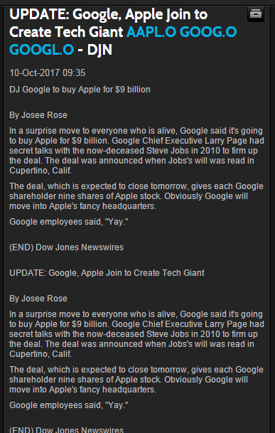 新浪科技訊 北京時(shí)間 10 月 11 日早間消息,在美股周二開盤后,道瓊斯通訊社因?yàn)椤凹夹g(shù)錯(cuò)誤”而發(fā)送了幾條假新聞標(biāo)題。這些新聞中有一條聲稱谷歌將斥資 90 億美元收購(gòu)蘋果。
