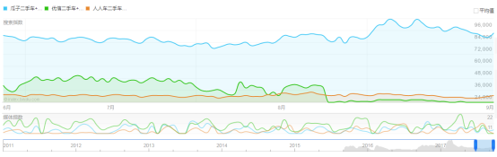 9月是進入旺季的開始,瓜子二手車與競品的領先優(yōu)勢進一步拉大,近期的整體搜索指數(shù)約為第二名人人車的4.6倍,優(yōu)信二手車的6.5倍。尤其,移動搜索指數(shù)優(yōu)勢更加凸顯,約為人人車的5倍以上,優(yōu)信二手車的近7.2倍。據(jù)了解,這與瓜子二手車一直重視發(fā)力移動端密不成分。