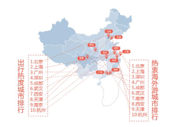 按照陳訴顯示,出行熱度城市排行榜前十的城市為:北京、上海、深圳、成都、武漢、西安、天津、南京、杭州;熱衷海外游城市排行前十的城市為:北京、上海、深圳、廣州、成都、武漢、南京、西安、天津、杭州。