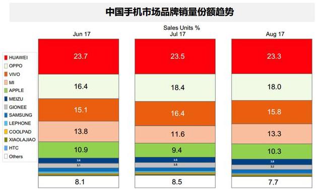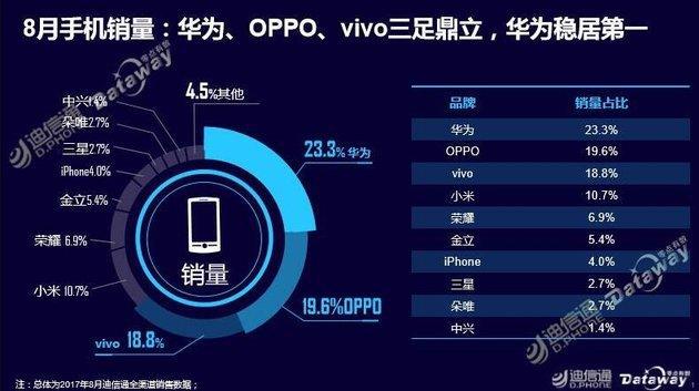 近日,迪信通發(fā)布了 2017 年 8 月手機(jī)銷量數(shù)據(jù)。從各個渠道的手機(jī)總銷量來看,華為表示依舊強(qiáng)勢,以23.3%的份額占據(jù)市場第一。