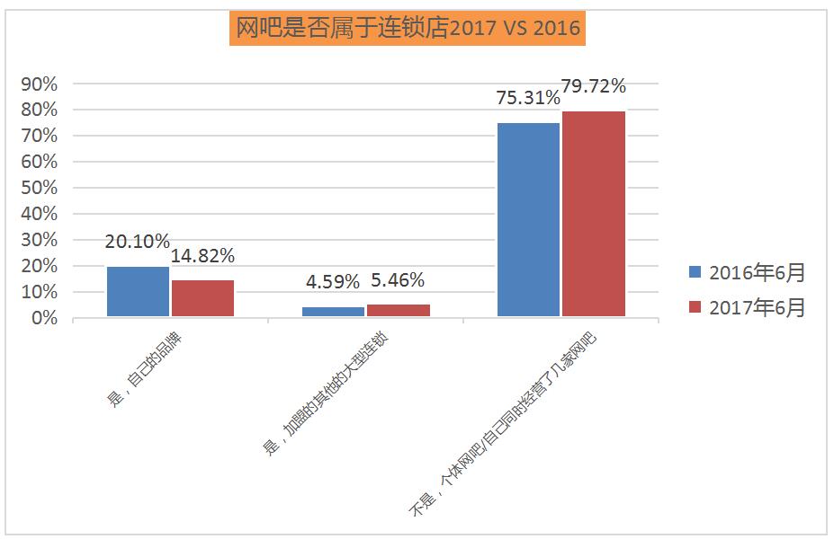 按照順網(wǎng)大數(shù)據(jù)陳訴藍皮書發(fā)布解密網(wǎng)吧娛樂產(chǎn)業(yè)顯示, 2017 年單體網(wǎng)吧市場占有率高達79.72%,相較于 2016 年75.31%增長了近 4 個百分點,自有品牌網(wǎng)吧份額縮減近 5 個百分點至14.82%,加盟的其他大型連鎖網(wǎng)吧增長近不到一個百分點,這也給了電競館從業(yè)者巨大機會。