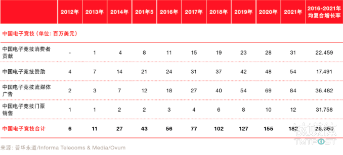 普華永道 2016 年- 2021 年中國娛樂及媒體市場展望指出,中國電子競技門票在 2021 年銷售規(guī)模將高達 1200 萬美元,年均復合增長率僅次于流媒體廣告為31.758%,消費者的直接貢獻和企業(yè)贊助增長表示亦不俗。