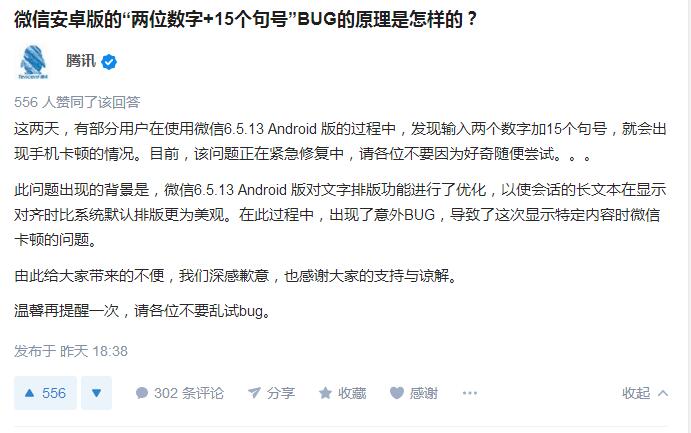 昨天下午,騰訊官方回應(yīng)稱,這兩天,有部分用戶在使用微信6.5.13 Android 版的過程中,發(fā)現(xiàn)輸入兩個數(shù)字加 15 個句號,,就會出現(xiàn)手機卡頓的情況。目前,該問題正在緊急修復(fù)中,請各位不要因為好奇隨便嘗試。。