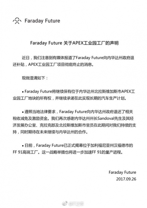 巨人網(wǎng)絡(luò)通訊聲明:本文標(biāo)題《法拉第未來內(nèi)華達(dá)工廠項目終止了? 賈躍亭澄清:中長期生產(chǎn)計劃不亂》,本文關(guān)鍵詞 法拉第,未來,內(nèi)華達(dá),工廠,;如發(fā)現(xiàn)本文內(nèi)容存在版權(quán)問題,煩請?zhí)峁┫嚓P(guān)信息告之我們,我們將及時溝通與處理。本站內(nèi)容系統(tǒng)采集于網(wǎng)絡(luò),涉及言論、版權(quán)與本站無關(guān)。
