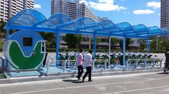 自行車停放點(diǎn)有著藍(lán)色的頂棚,本年 3 月在街頭動(dòng)工建設(shè)時(shí),曾引起部分平壤市民的好奇圍不雅觀。對(duì)于他們來說,共享單車很新鮮。