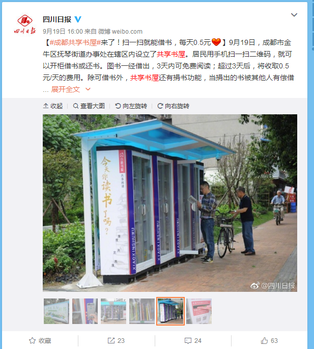 據(jù)四川日報報道, 9 月初,成都市金牛區(qū)設立了共享書屋,居民只要用微信掃一掃共享書屋上的二維碼,就可以進行借書或還書的操作。同時,書屋還有捐書的功能,只要發(fā)布共享書信息,書本投遞成功就能完成圖書共享。