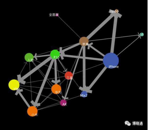 從關(guān)聯(lián)度分析圖看,小秘書發(fā)現(xiàn),微博網(wǎng)友在提及iPhone的時(shí)候,三星、華為、OPPO、VIVO、P10、MIX2、S8、人臉、AR、全面屏等被重點(diǎn)提及。