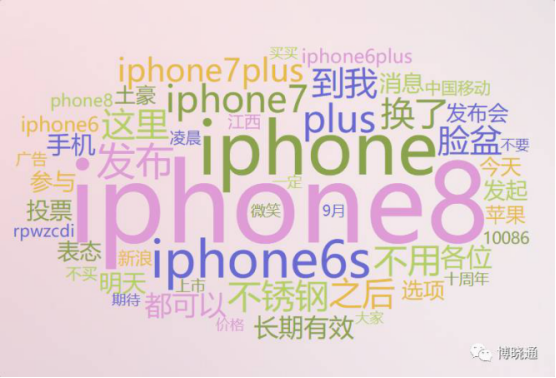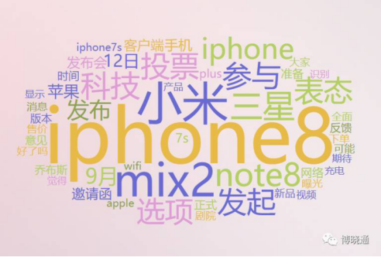 發(fā)布會(huì)后iPhone8 及關(guān)聯(lián)詞的詞云圖(數(shù)據(jù)來源:博曉通)