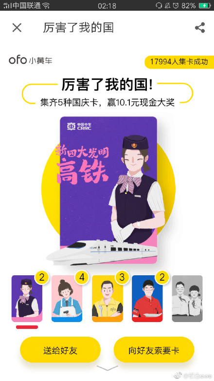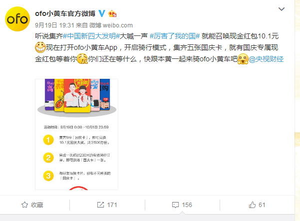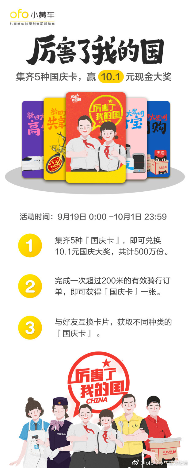 巨人網(wǎng)絡(luò)通訊聲明:本文標(biāo)題《福利!ofo小黃車推集“國(guó)慶卡”活動(dòng),共500萬(wàn)份10.1元現(xiàn)金》,本文關(guān)鍵詞 福利,ofo,小黃,車推集,國(guó)慶卡,;如發(fā)現(xiàn)本文內(nèi)容存在版權(quán)問(wèn)題,煩請(qǐng)?zhí)峁┫嚓P(guān)信息告之我們,我們將及時(shí)溝通與處理。本站內(nèi)容系統(tǒng)采集于網(wǎng)絡(luò),涉及言論、版權(quán)與本站無(wú)關(guān)。