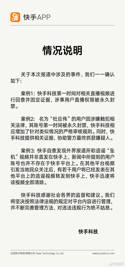 快手科技感謝社會各界的監(jiān)督和建議。我們將堅決根據(jù)法律法規(guī)的規(guī)定對平臺內(nèi)容進行辦理,并不停完善辦理方法,對違法違規(guī)行為絕不姑息。