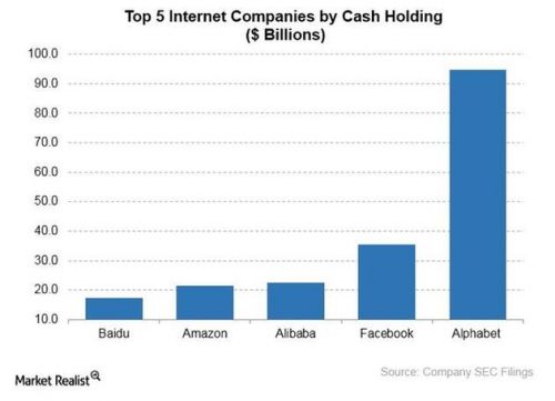 別的,亞馬遜以 215 億美元的現(xiàn)金和短期投資排名第四。值得注意的是,由于蘋果公司首要是出產(chǎn)手機、平板、電腦等智能設備硬件的,所以并沒有被列入互聯(lián)網(wǎng)公司的陣營中。