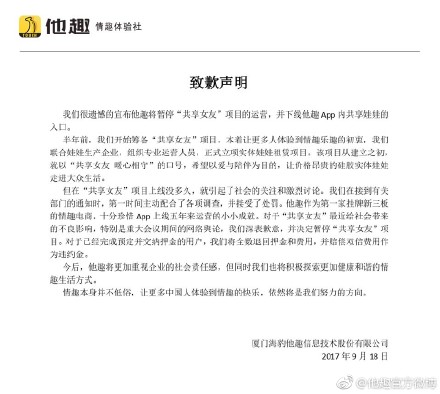我們很遺憾的頒布頒發(fā)他趣將暫停“共享女友”項(xiàng)目的運(yùn)營,并下線他趣App內(nèi)共享娃娃的入口。