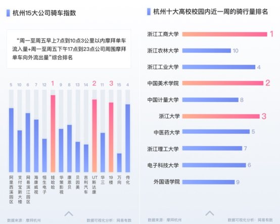 而在十大高校校園內近一周的騎行量排名中,浙江工商大學超越浙江大學排名第一,中國美術學院緊隨其后,浙江大學(華家池)僅排名第三。