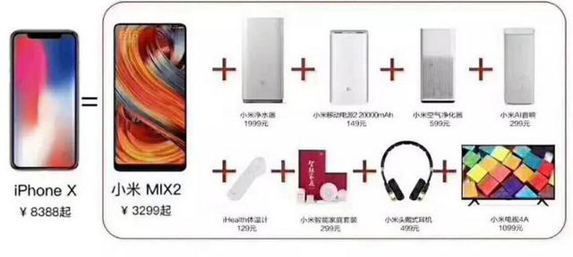 有人打趣說,一臺(tái)最高配iPhoneX 256GB( 9688 元)=小米MIX2 256GB( 3999 元)+小米凈水器( 1499 元)+小米空氣凈化器2( 699 元)+小米電視4A55 寸( 2699 元)+iHealth體溫計(jì)( 129 元)+小米充電寶210000 毫安( 79 元)+小米智能家庭套裝( 329 元)+小米AI音響( 299 元)+小米活塞耳機(jī)青春版( 29 元)。