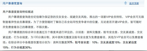 在世紀(jì)佳緣也有所謂的“用戶靠譜度”評價(jià),按照世紀(jì)佳緣官網(wǎng)介紹,用戶靠譜度查詢是世紀(jì)佳緣為保證交友安適、規(guī)避交友風(fēng)險(xiǎn),推出的一項(xiàng)新VIP會(huì)員特權(quán), VIP會(huì)員可無限制查看異性會(huì)員靠譜度。其評分主要從資料可信度、賬號安適、交友真誠度、交友緊迫度、行為合規(guī)度 5 個(gè)方面考量, 100 分滿分制。