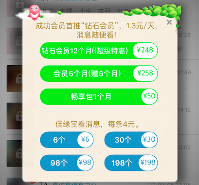世紀(jì)佳緣首推的是“鉆石會(huì)員”,每天1. 3 元,包月優(yōu)惠價(jià) 50 元,包年優(yōu)惠價(jià) 248 元。此外,還有佳緣寶分條收費(fèi),每條 4 元,打包組合分為 6 個(gè)、 30 個(gè)、 98 個(gè)、 198 個(gè),均為每條 1 元。