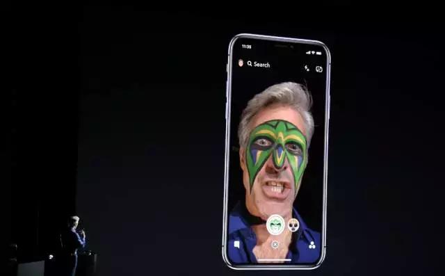 Face ID 的面部墜重功能,能夠和 AR Kit 結(jié)合,拍出一種奇怪的面具佩戴功能。