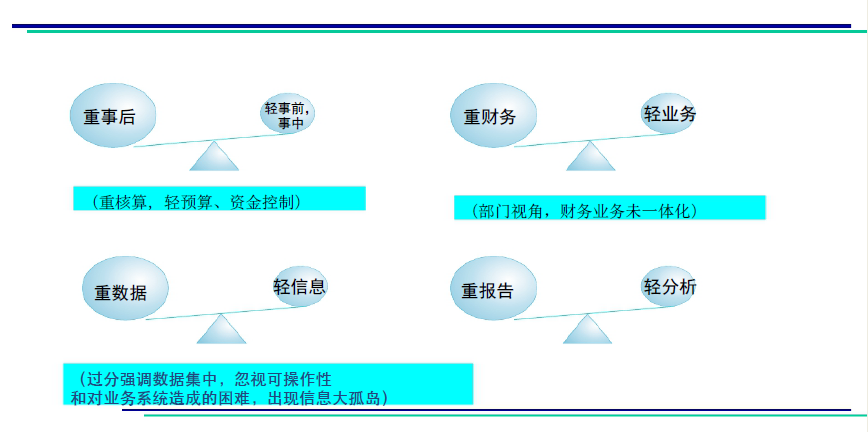 傳統(tǒng)財務業(yè)務流程的毛病日益顯現(xiàn)。從作業(yè)角度看,我國大部分財務人員的財務工作65%在處理交易,19%在控制與風險辦理,12%在做決策支持,而只有4%在做真正的財務本能機能辦理。財務缺乏戰(zhàn)略思維、財務目標缺乏與戰(zhàn)略目標的整合,重財務輕業(yè)務,難以實現(xiàn)財務與業(yè)務一體化;重數(shù)據(jù)、輕信息,出現(xiàn)信息孤島;重陳訴、輕分析,決策支持信息系統(tǒng)缺乏;大量財務人員埋頭于核算,信息化的水平不高;財務人員難以脫身去從事辦理會計工作,大量分子公司的會計核算造成會計隊伍龐大,占用成本,實施所謂“人海戰(zhàn)術”等,傳統(tǒng)的會計信息系統(tǒng)的毛病逐漸袒露,企業(yè)財務轉型愈加迫切。