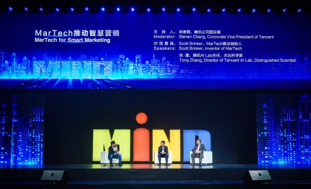 騰訊公司副總裁鄭香霖,MarTech概念創(chuàng)始人Scott Brinker,騰訊AI Lab主任及杰出科學(xué)家張潼在峰會(huì)現(xiàn)場(chǎng)進(jìn)行對(duì)話