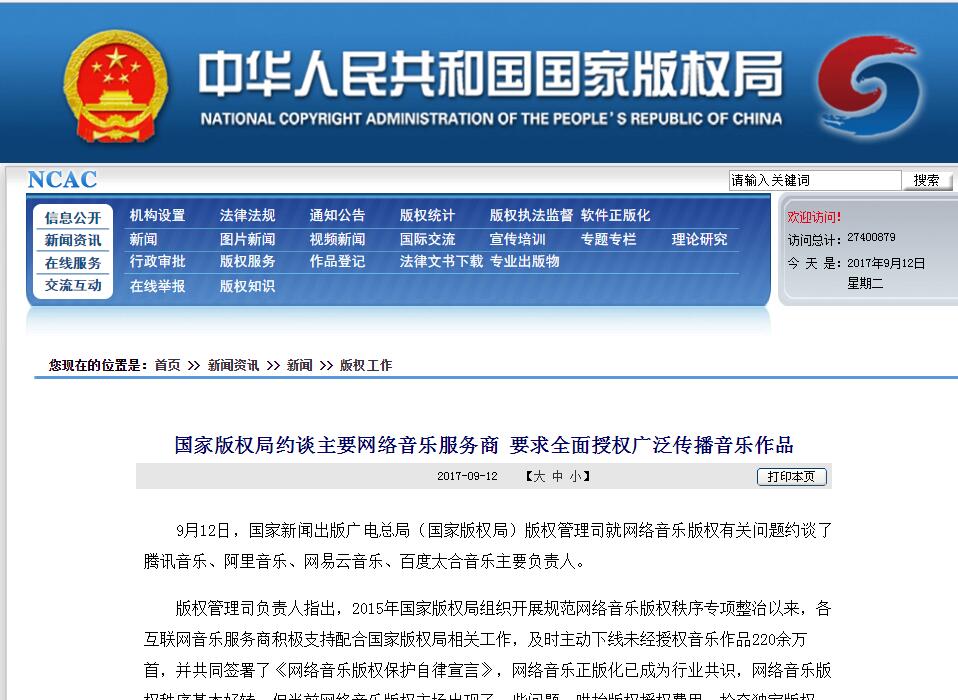 據(jù)國家版權(quán)局網(wǎng)站消息,今日,國家新聞出版廣電總局(國家版權(quán)局)版權(quán)辦理司就網(wǎng)絡(luò)音樂版權(quán)有關(guān)問題約談了騰訊音樂、阿里音樂、網(wǎng)易云音樂、百度太合音樂主要負(fù)責(zé)人。