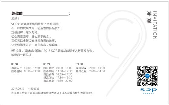果不其然,今天有部分媒體陸續(xù)收到了SOP品牌戰(zhàn)略暨新品發(fā)布會邀請函,內(nèi)容顯示SOP將于 9 月 19 日在江蘇鹽城舉行發(fā)布會,發(fā)布會主題為“贏未來, 9 現(xiàn)在”,盡管官方?jīng)]有透露更多具體的信息,但是聯(lián)想到此前SOP發(fā)布的新品S7,S9 基本已經(jīng)可以確定是他們此次發(fā)布會的主角之一。