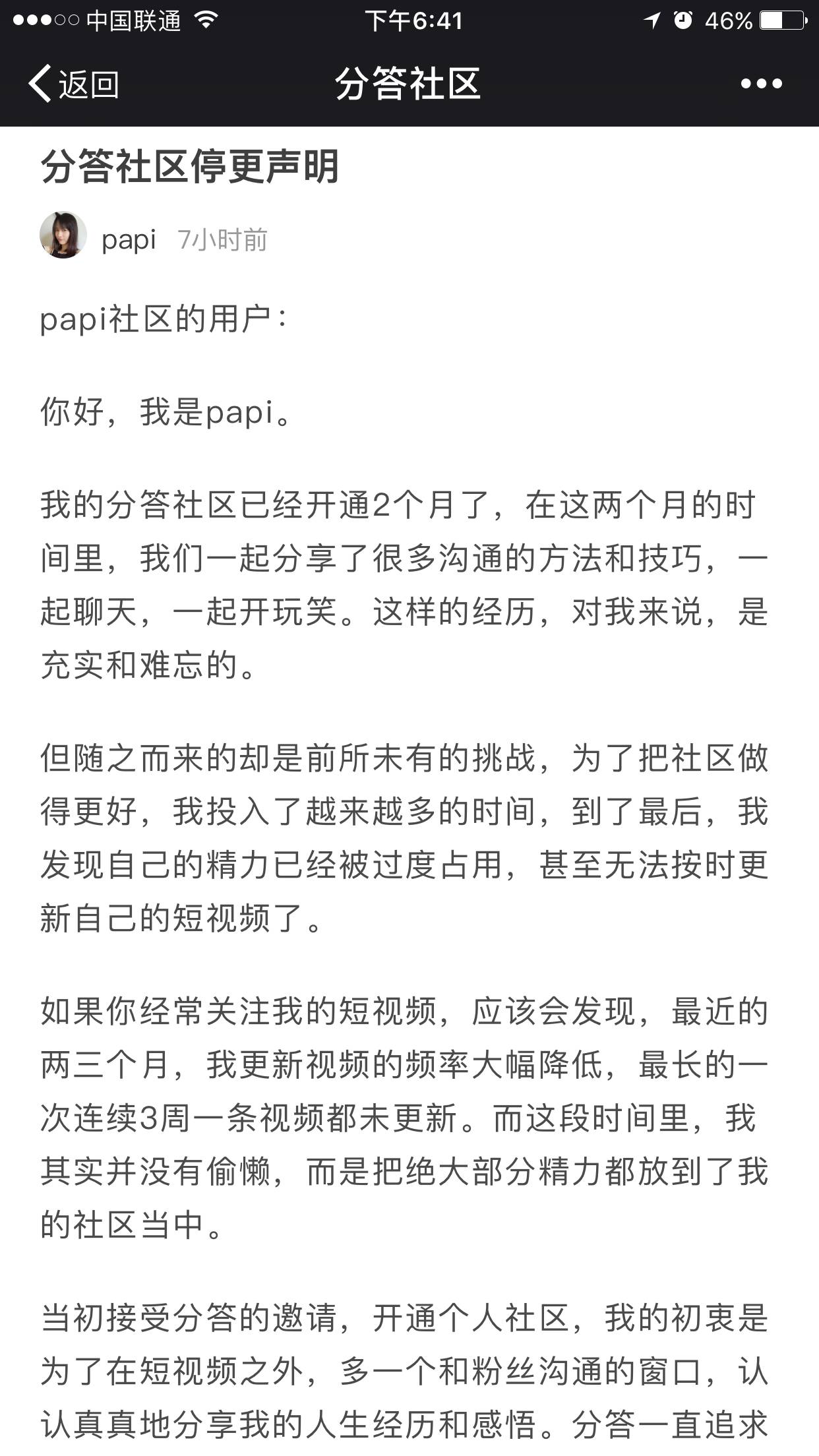 羅永浩前段時(shí)間在得到上停更了他的付費(fèi)專欄,就在今天Papi醬也在她的分答社區(qū)發(fā)布了《停更聲明》,頒布頒發(fā)停止更新并退還用戶所有費(fèi)用。