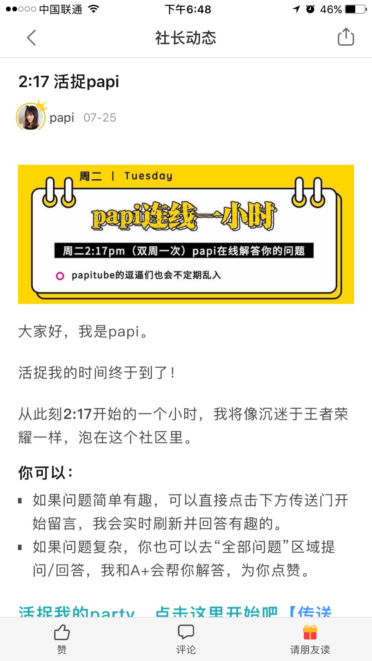 其中有一個(gè)文章欄目叫做《活捉Papi醬》,就是Papi醬在線 2 小時(shí),和社區(qū)用戶在線問(wèn)答的一個(gè)環(huán)節(jié)。