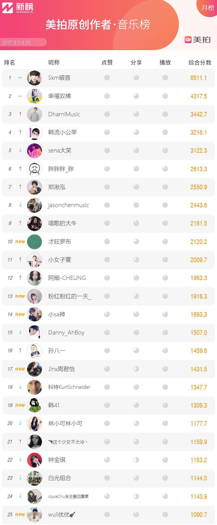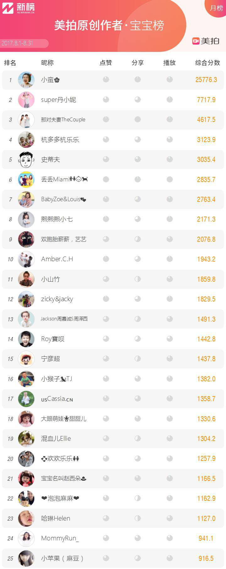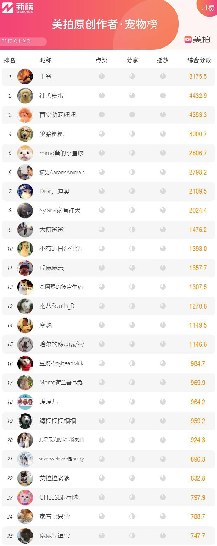 新榜聯(lián)合短視頻社區(qū)美拍推出美拍達(dá)人影響力榜單,旨在以多維度數(shù)據(jù)展現(xiàn)美拍達(dá)人影響力并形成激勵機制。今天推出第 13 期,本次榜單統(tǒng)計周期是 8 月 1 日到 8 月 31 日,統(tǒng)計截止 31 日 24 時止。