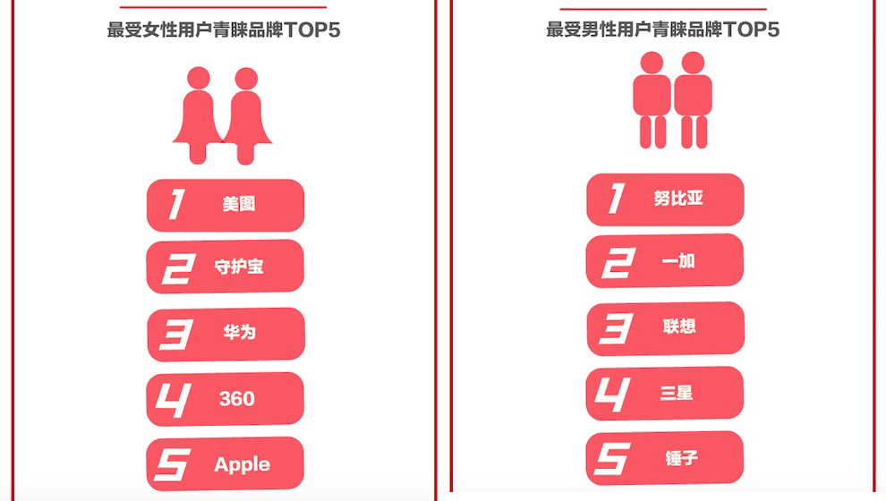 在最受女性用戶青睞品牌榜上,美圖、守護(hù)寶、華為、 360 和Apple占據(jù)前五,而在最受男性用戶青睞品牌Top5 中,努比亞、一加、聯(lián)想、三星和錘子上榜。從這些品牌的整體特征看,女性用戶對(duì)“顏值”更為關(guān)注,同時(shí)更注重拍照、美圖等功能;而男性用戶往往對(duì)手機(jī)硬件自己與性價(jià)比等有著多方面的考量,努比亞、一加和錘子等的上榜也表現(xiàn)這些品牌背后的“工科”特質(zhì)。