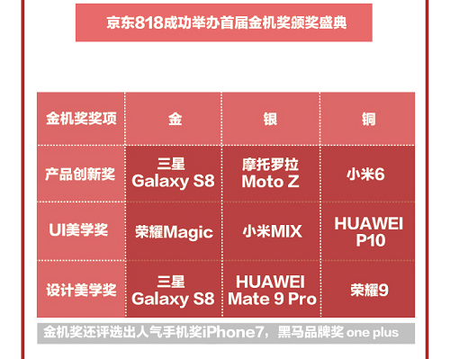 在剛剛過(guò)去的 8 月份,京東還舉辦了首屆金機(jī)獎(jiǎng)?lì)C獎(jiǎng)盛典,眾多優(yōu)秀產(chǎn)品脫穎而出。其中,受女性用戶青睞的華為品牌別離憑借HUAWEI Mate9 Pro和HUAWEI P10 拿下了設(shè)計(jì)美學(xué)和UI美學(xué)的銀獎(jiǎng)和銅獎(jiǎng);而受男性用戶青睞的三星品牌憑借三星Galaxy S8 一舉拿下產(chǎn)品創(chuàng)新獎(jiǎng)和設(shè)計(jì)美學(xué)獎(jiǎng)雙料金獎(jiǎng);此外,女性用戶青睞品牌的iPhone憑借iPhone7 拿下人氣手機(jī)獎(jiǎng),,男性用戶關(guān)注的一加品牌則榮獲黑馬獎(jiǎng)。這也從側(cè)面證明,京東金機(jī)獎(jiǎng)評(píng)選很好地反映了當(dāng)前男女用戶對(duì)手機(jī)愛(ài)好追求的趨勢(shì)。