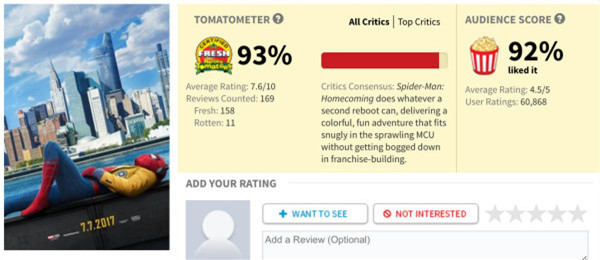 《蜘蛛俠:英雄歸來》 9 月 8 日零點(diǎn)場(chǎng)一經(jīng)上映,就取得 1050 萬票房的好成績(jī),成為繼《鋼鐵俠3》、《復(fù)仇者聯(lián)盟2》、《美國隊(duì)長(zhǎng)3》之后第四部午夜場(chǎng)票房破千萬的MCU電影。電影自全球上映以來,也取得了絕佳的票房和口碑成績(jī),不但口碑方面和同期上映的兩部大片齊平,取得爛番茄93%的好成績(jī),并且在不雅觀眾打分層面更高一籌,爆米花指數(shù)92%。