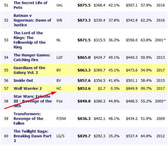 《戰(zhàn)狼2》全球票房排行升至 57 位