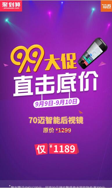 重磅消息!新一輪促銷攻擊波就來開始了! 9 月 9 日- 9 月 10 日 70 邁智能后視鏡擊穿低價,天貓聚劃算直降 110 元,僅售 1189 元。只有兩天!活動后恢復(fù)原價, 9 月狂歡就看這一波!