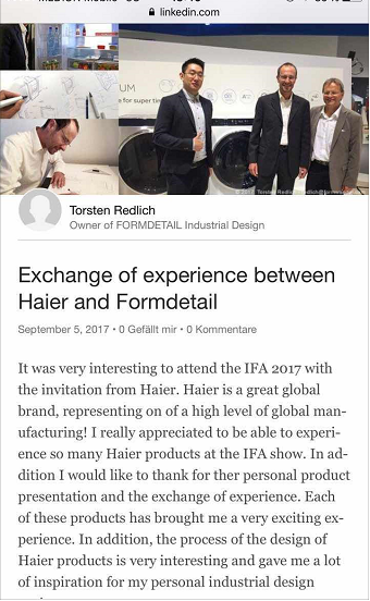 事實上,Torsten Redlich不止是海爾新晉用戶,更稱海爾為“創(chuàng)意老師”:這從他在全球領(lǐng)先的職業(yè)社交平臺LinkedIn對海爾的贊美便可印證。Torsten Redlich在其LinkedIn賬號發(fā)布與海爾智慧家電的“自拍”,并稱“海爾是一個非常棒的全球化品牌,代表全球制造業(yè)最高水平!很高興能夠在IFA展上體驗到如此多的海爾產(chǎn)品,每一款產(chǎn)品都給我?guī)砹朔浅U鸷车氖褂皿w驗。海爾產(chǎn)品的工藝設(shè)計非常巧妙,給了我我很多靈感,接下來我將會這些靈感應(yīng)用到我的最新設(shè)計中?!?/p>