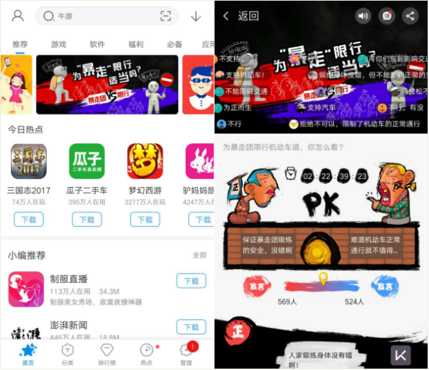 經(jīng)過(guò)兩輪辯論,正反雙方還是相持不下,于是,正方想去“看看大V們都怎么說(shuō)”,而反方覺(jué)得“要不去知乎瞅瞅”。對(duì)此, 360 手機(jī)助手為雙方送上微博和知乎兩大社交類(lèi)APP,讓他們可以充分了解其他人的想法。