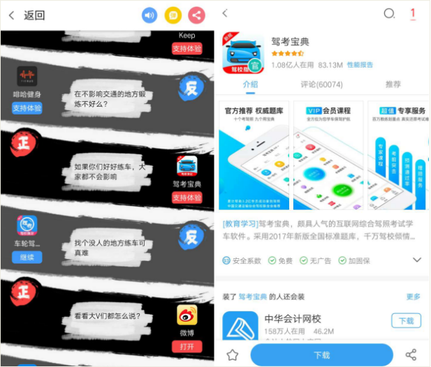 除了“熬煉身體是否有錯(cuò)?”,正反雙方還把爭(zhēng)論的焦點(diǎn)放在了“練車(chē)”上。正方認(rèn)為“如果你們好好練車(chē),大家都不會(huì)影響”,并獻(xiàn)上 360 手機(jī)助手上的“駕考寶典”APP,百萬(wàn)教練幫你劃重點(diǎn),全方位為你學(xué)車(chē)保駕護(hù)航。