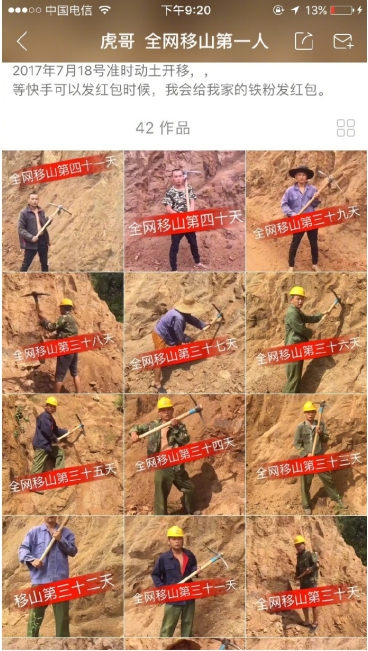 “愚公移山”是《列子·湯問》里的故事,作者是春秋戰(zhàn)國的列御寇,講述了愚公堅持不懈,挖山不止,最終感動天帝而將山挪走的故事。然而現(xiàn)實里的這位移山人就是快手上的一位普通用戶,自稱“虎哥”。 2017 年 7 月 18 日起,虎哥開始動土,用鐵鍬一鏟一鏟要把丘陵一般的黃土坡移走,把“愚公移山”這則寓言故事真真切切地付之于行動。