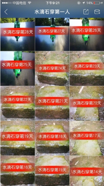 “滴水穿石”出自宋代羅大經(jīng)的《鶴林玉露·一錢斬吏》,其中有一句“乖崖援筆判曰:'一日一錢,千日千錢,繩鋸木斷,水滴石穿”,意在比方雖然力量小,但只要目標(biāo)專一,持之以恒,就必然能把艱難的事情辦成。叫做“水滴石穿第一人”的快手用戶憑借一個大雪碧瓶子,一塊石頭開始了水滴石穿的實踐。看似無用的行為,卻有網(wǎng)友道出了其中真理:“水滴石穿不是誰的力量,而是重復(fù)的力量。重復(fù)的力量不是相加而是相乘,有路,就大膽去走,有夢,就大膽翱翔。